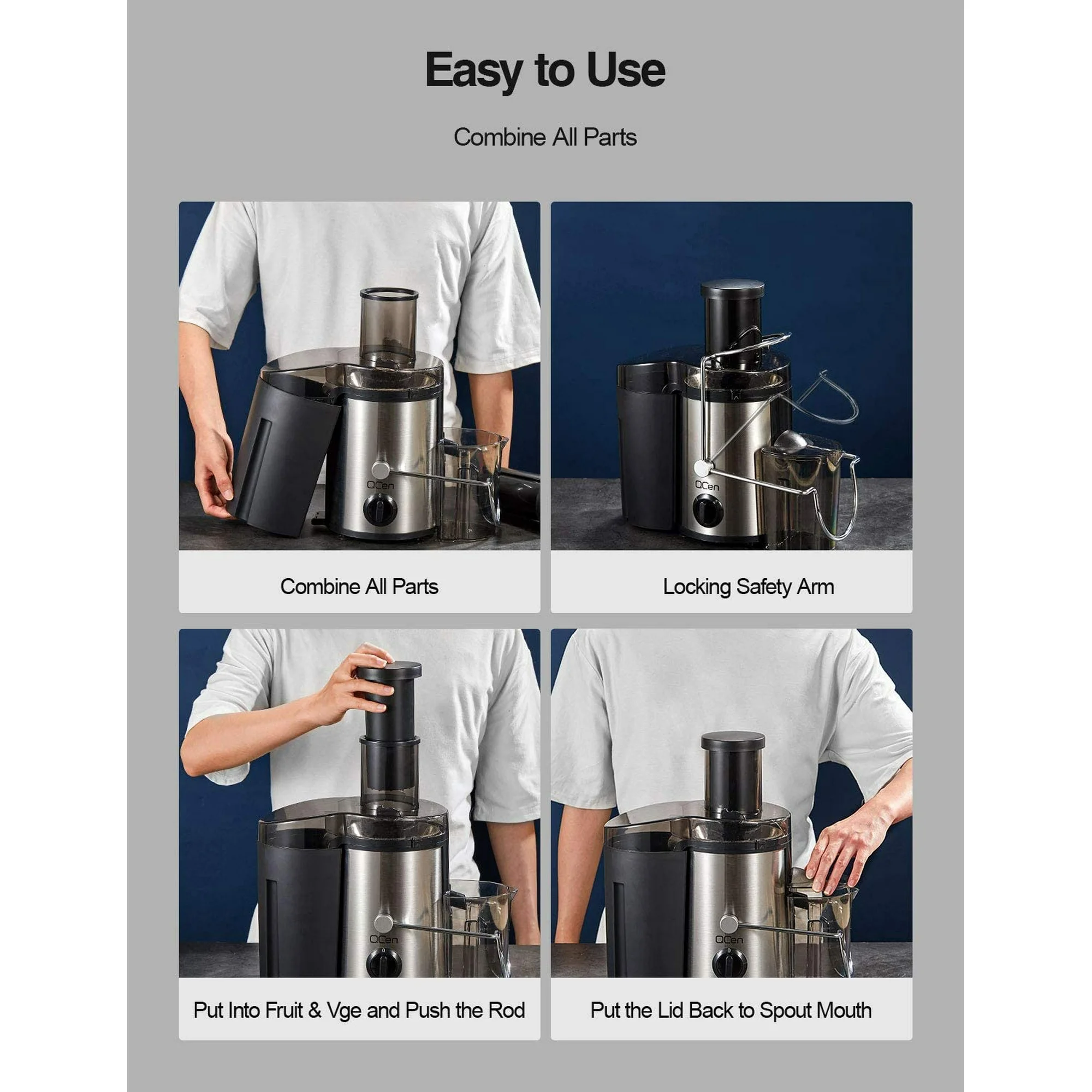 • Wide Chute: Equipped with a 3-inch wide mouth feed chute, saving time on pre-cutting fruits and vegetables before juicing.